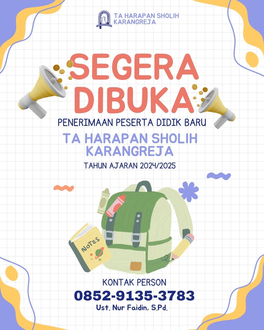 TA Harapan Sholih Karangreja adalah lembaga pendidikan swasta yang menekuni pendidikan anak usia dini. Didirikan pada tanggal 15 juli 1999 dengan nomor izin pendirian, Nomor WK/S-B/RA/26/PGM/2000, 03 Juli 2000 dan terakreditasi B. TA Harapan Sholih Karangreja di bawah naungan kementrian Agama. TA Harapan Sholih merupakan salah satu unit pendidikan di Yayasan Islam Nurul Huda Desa Karangreja, Kecamatan Kutasari dan K.H. Ali Mubarok, M.Pd. sebagai ketua Yayasannya.